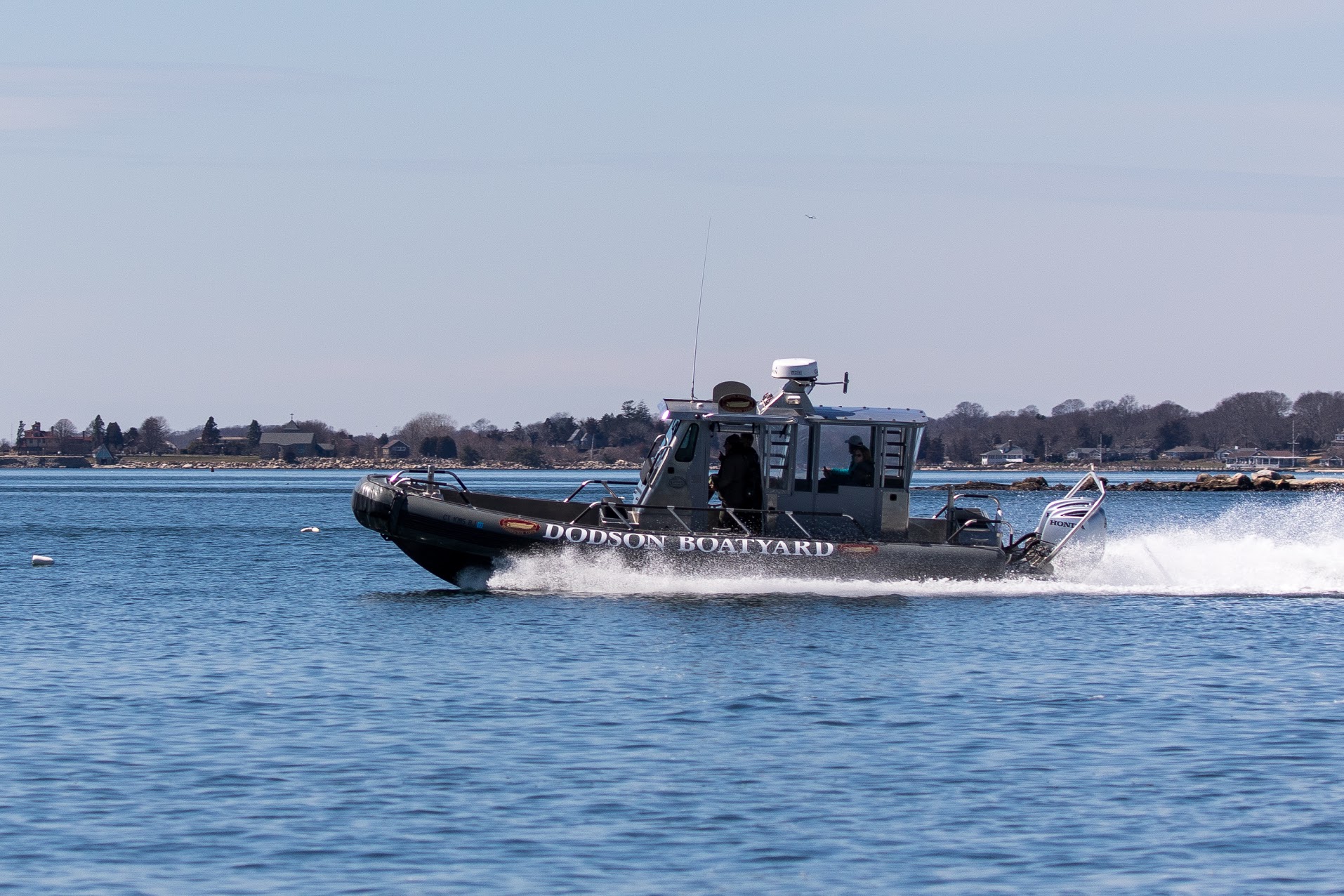 Beyond this beautiful, protected, scenic harbor. Beyond this scenic, well-kept village. Beyond all else, Dodson Boatyard prides itself on providing high level, efficient, personal, and timely service to its customers. There is no better reflection of that commitment to this critical component of its operation than the recently acquired service vessel M/V ALERT. ALERT is a 30’ military grade custom built craft constructed by Safe Boat International of Bremerton, WA. Dodson Boatyard acquired the boat in 2016 and it quickly proved its worth. If you were here last season it is likely you’ve seen it at its slip at the head of the main dock. Though it appears to be a large HBI, it is actually an aluminum hull surrounded by large fenders, and is equipped with a large hardtop and four dampened seats including seat belts, arm and foot rests and handles, allowing for secure high speed movement. It is fully equipped with all essential safety equipment, has towing capability and is powered by twin 250 HP Honda outboards enabling (very) speedy access to locations from western Long Island Sound, eastern Long Island, and the Massachusetts islands. Indeed, during the 2016 season ALERT logged 286 hours of transit to and from service calls. (Examples of transit times include 45 minutes to Shelter Island or 2 hours to Greenwich, CT, Oyster Bay, NY, or Nantucket. All of these times are significantly less than road travel.) The crew of ALERT always includes experienced technicians and qualified boat handlers. The rapid response time availed by this exceptional asset truly sets Dodson Boatyard’s service capability beyond any other known boatyard in our region.